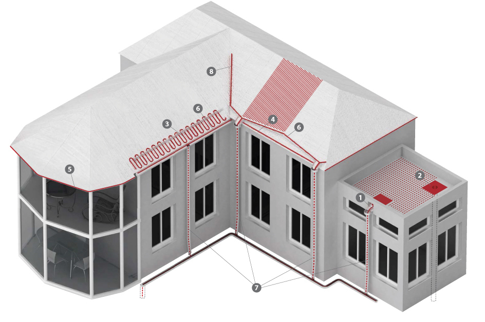 Для того, что бы талая вода могла уходить с кровли в наиболее важных местах прокладывается греющий кабель. Наиболее подверженными образованию льда являются следующие элементы кровли: